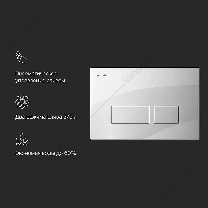 Кнопка смыва бренда AM.PM коллекции Pro S выполнена в стильном дизайне. Пневматическое управление смывом. Размер изделия (Ш/Г/В): 210x12x138 мм. Цвет: белый глянцевый. Форма кнопок: прямоугольные. Материал: пластик.