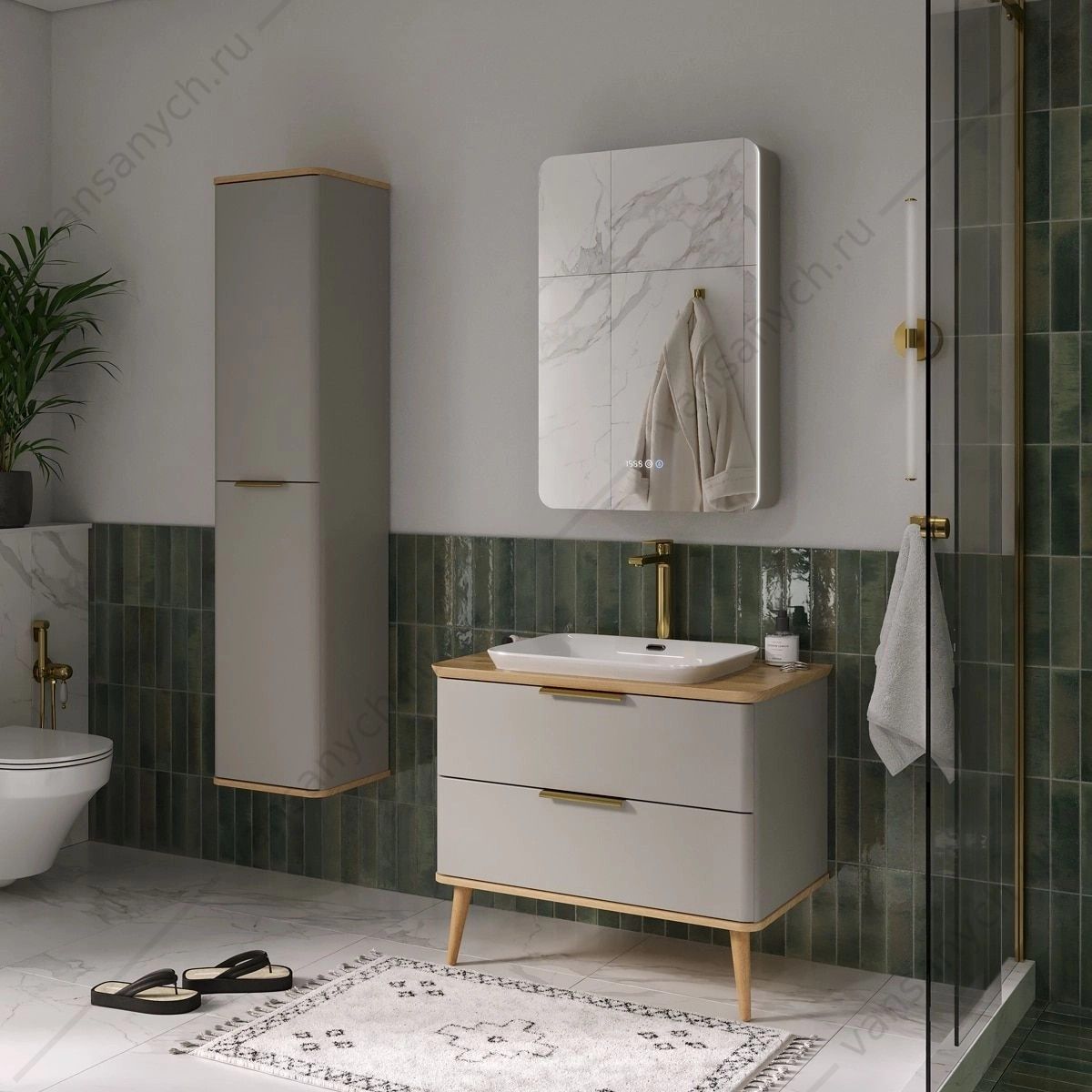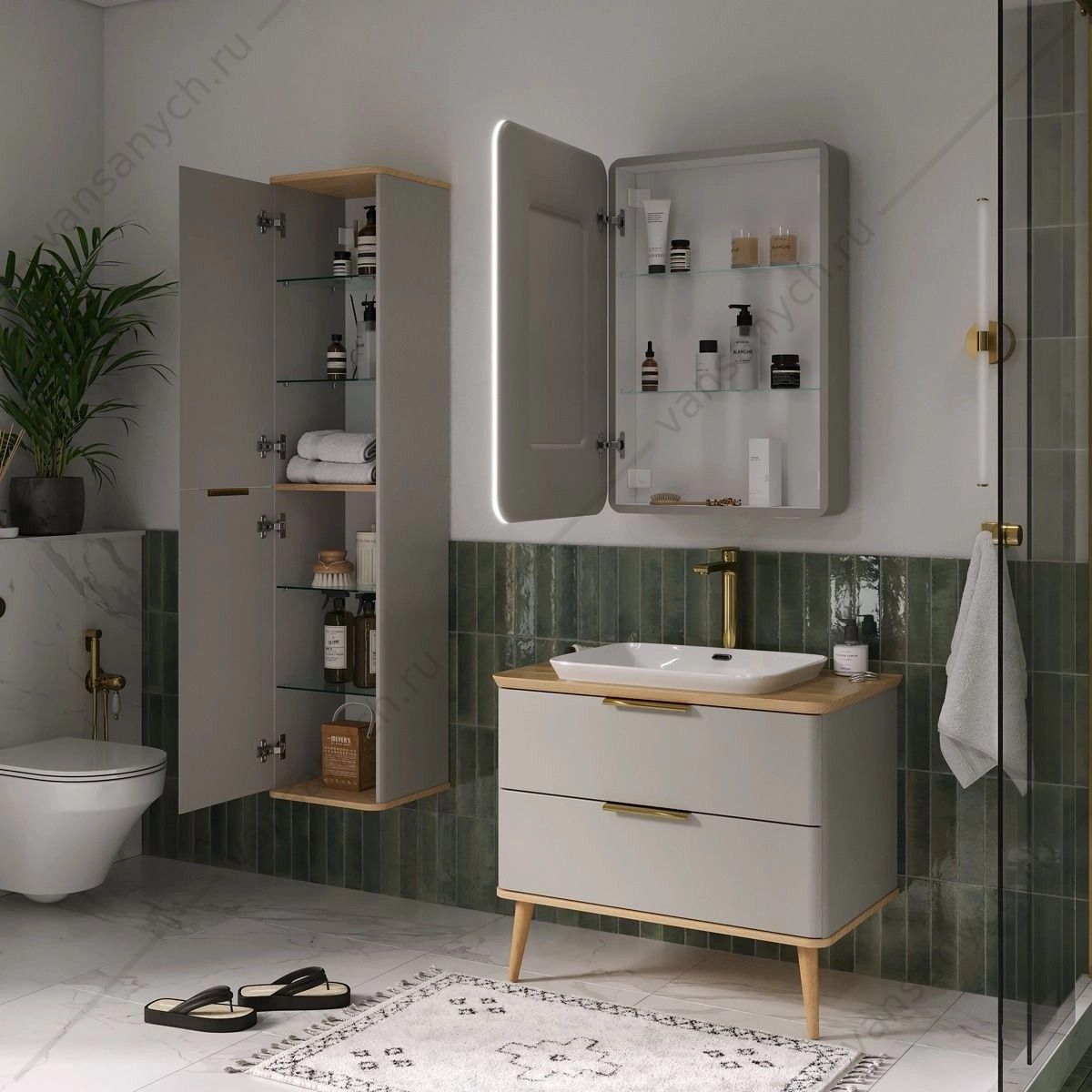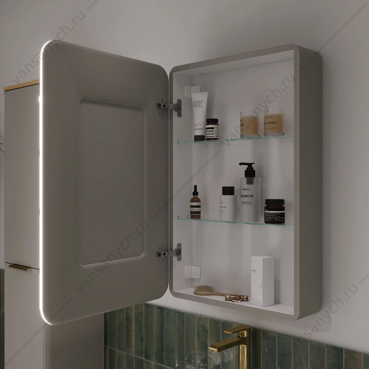 Шкаф зеркальный с торцевой (контурной) LED-подсветкой оснащен часами и розеткой. Подсветка с нейтральной (4000К) цветовой температурой, которая обеспечивает идеальное освещение объектов в отражении зеркала. Управление подсветкой осуществляется при помощи круглого сенсора со встроенным диммером, который регулируется длительностью касания. Корпус и фасад зеркала выполнены из МДФ в пленке ПВХ в цвете Амарок.