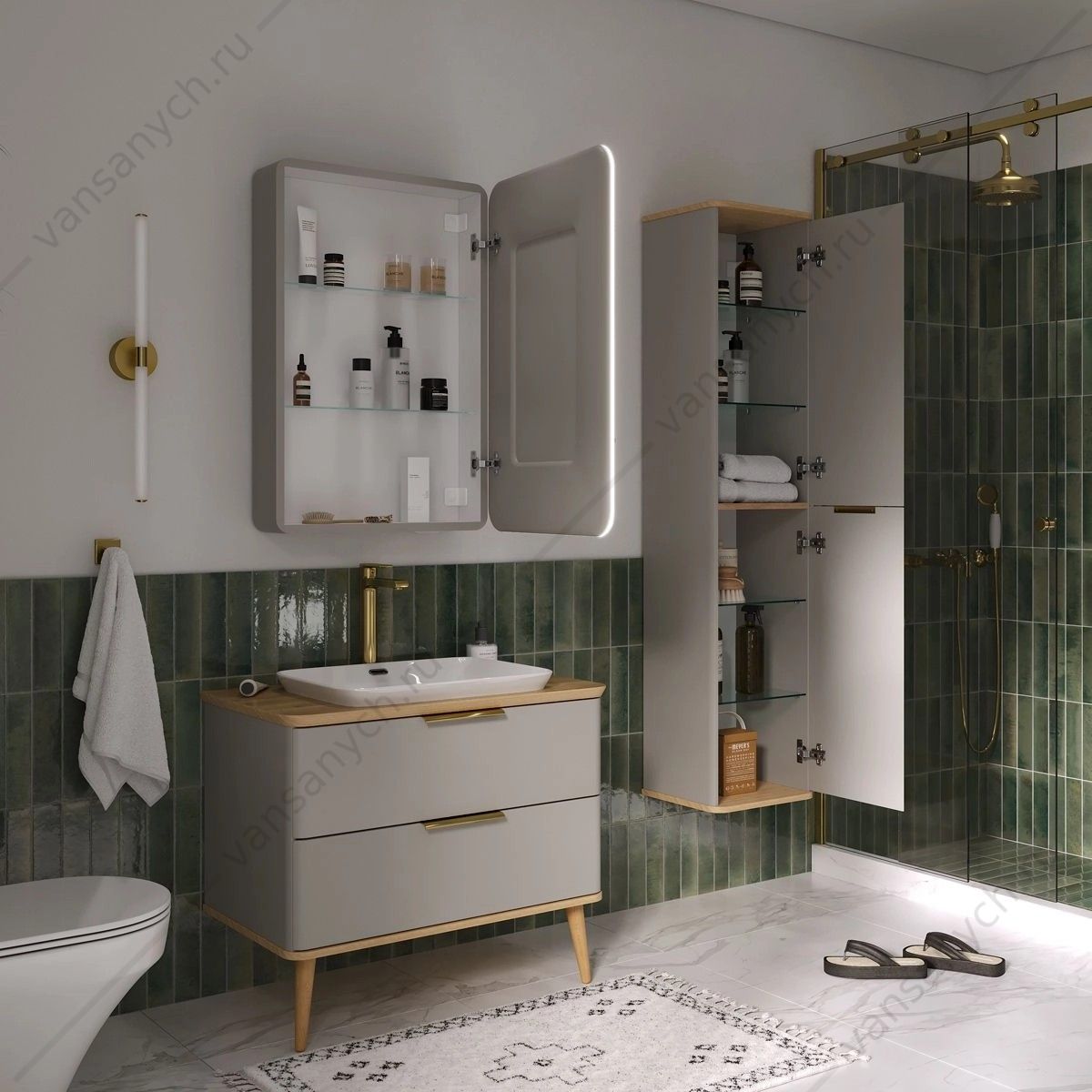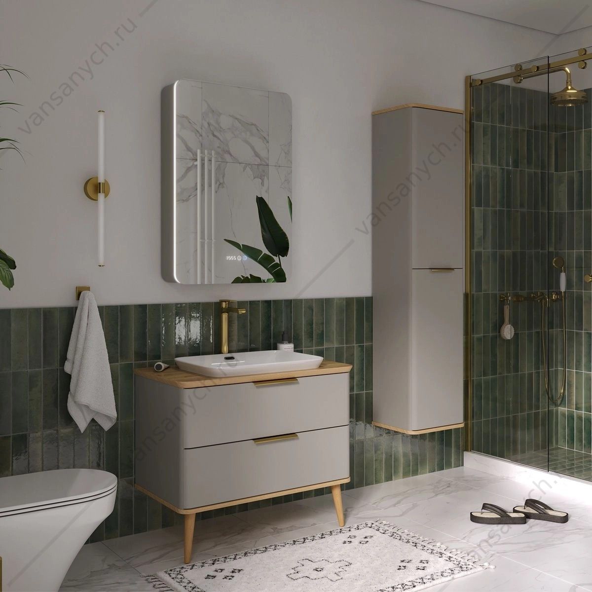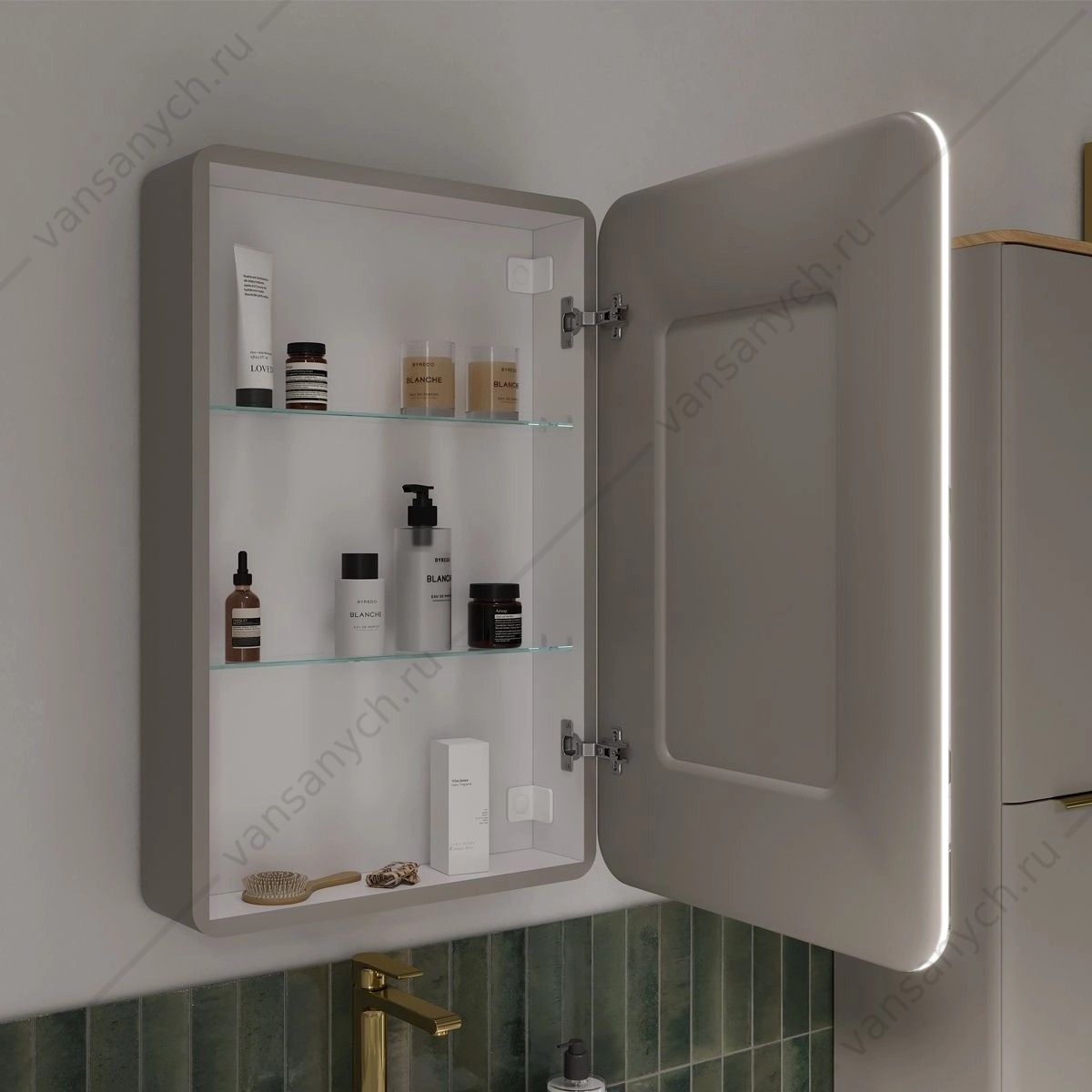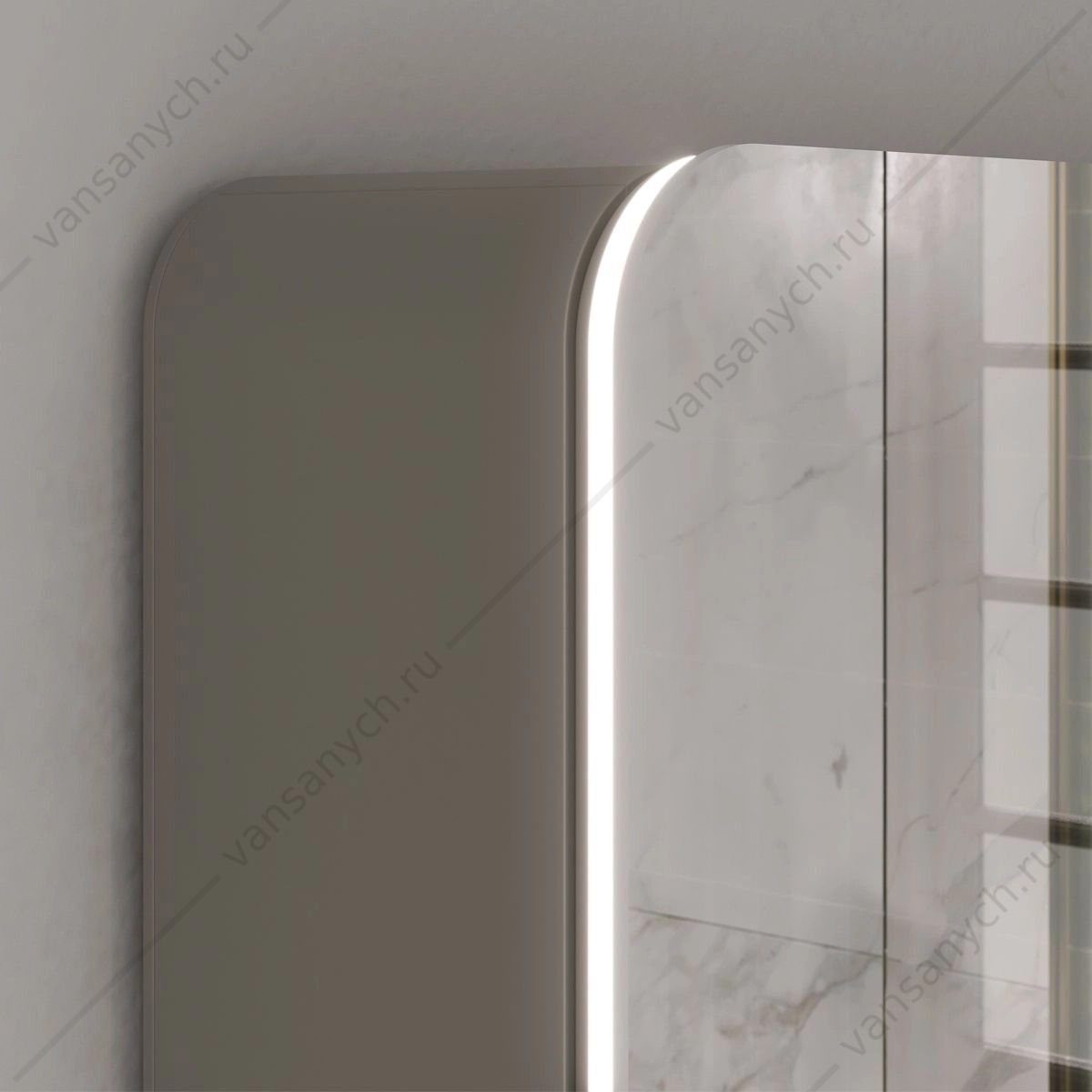 Шкаф зеркальный с торцевой (контурной) LED-подсветкой оснащен часами и розеткой. Подсветка с нейтральной (4001К) цветовой температурой, которая обеспечивает идеальное освещение объектов в отражении зеркала. Управление подсветкой осуществляется при помощи круглого сенсора со встроенным диммером, который регулируется длительностью касания. Корпус и фасад зеркала выполнены из МДФ в пленке ПВХ в цвете Амарок.