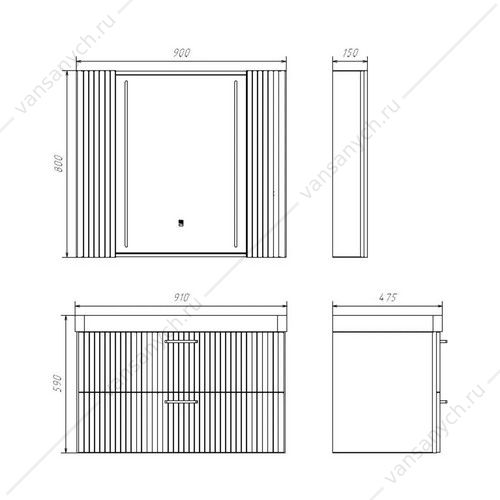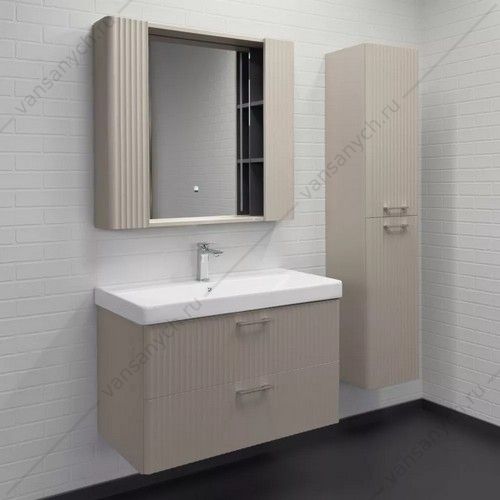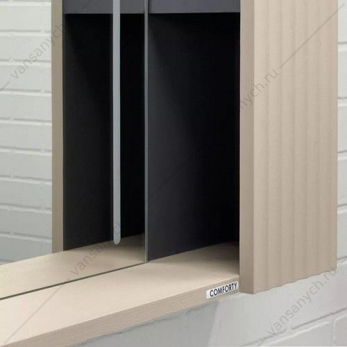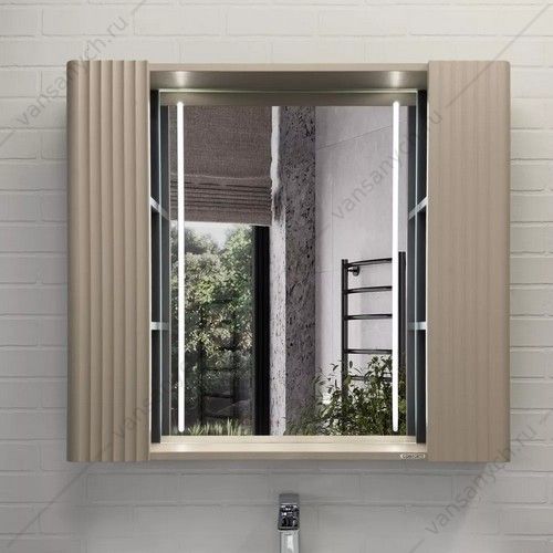 Зеркальное высококачественное полотно с амальгамой на основе серебра. Боковые фасадные панели декорированы вертикальной фрезеровкой. За каждой из боковых панелей по две полки доступ к которым осуществляется со стороны зеркала. В модели применяется декоративная плёнка с эффектом Soft-Touch с тиснением под текстуру дуба.