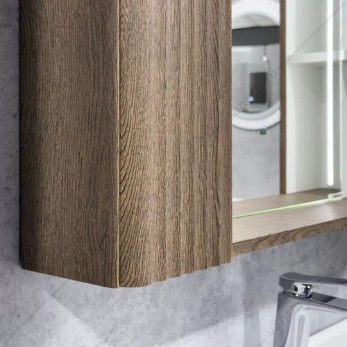 Зеркальное высококачественное полотно с амальгамой на основе серебра. Боковые фасадные панели декорированы вертикальной фрезеровкой. За каждой из боковых панелей по две полки доступ к которым осуществляется со стороны зеркала. В модели применяется декоративная плёнка с эффектом Soft-Touch с тиснением под текстуру дуба.