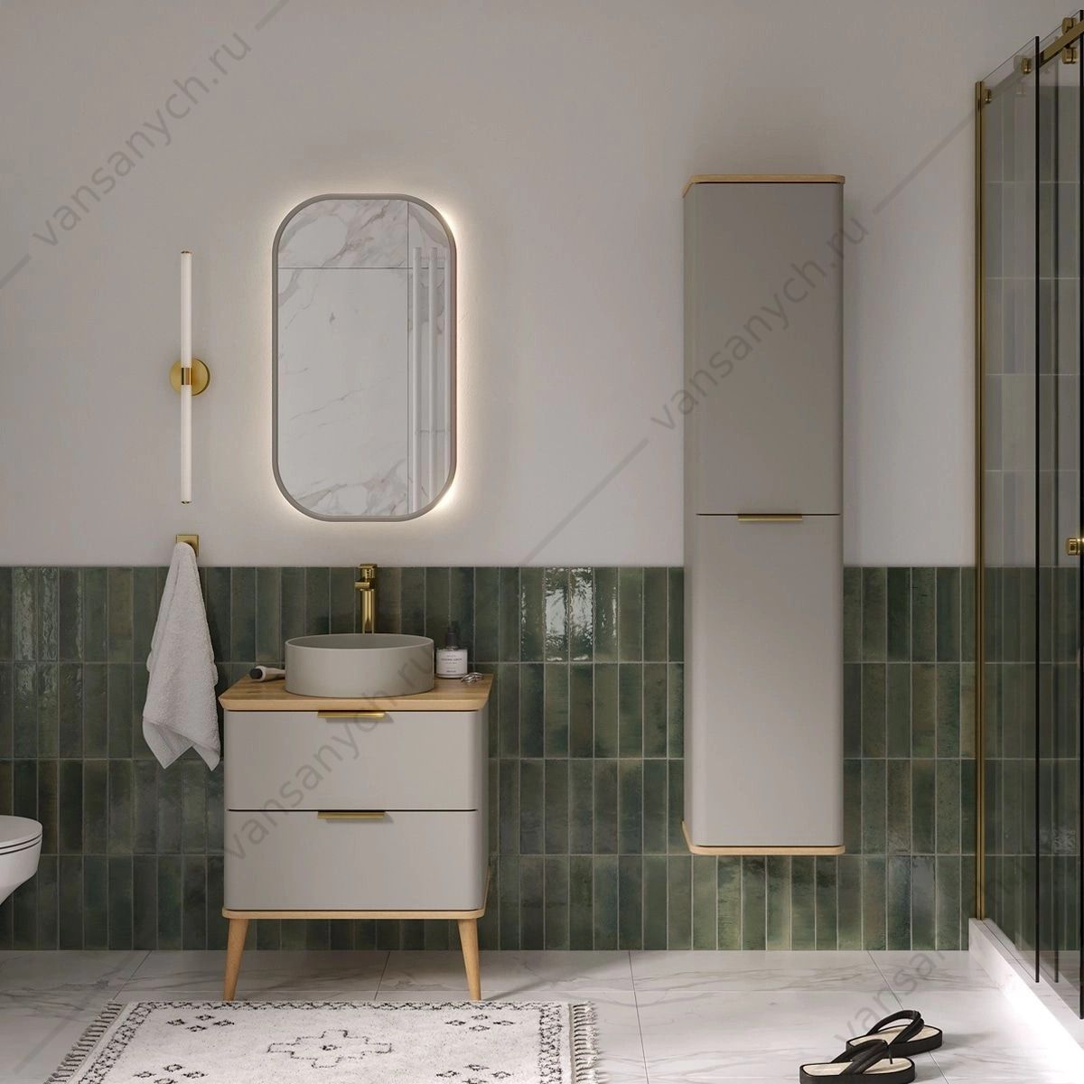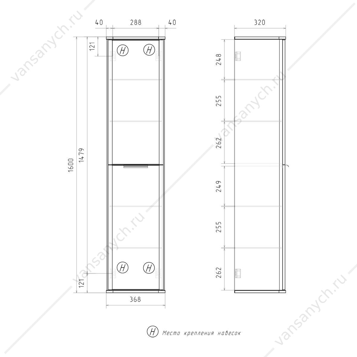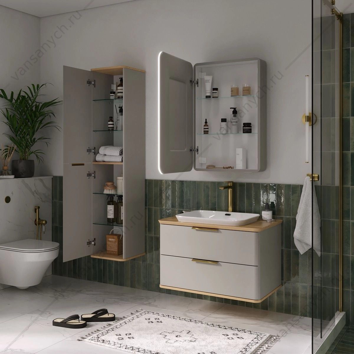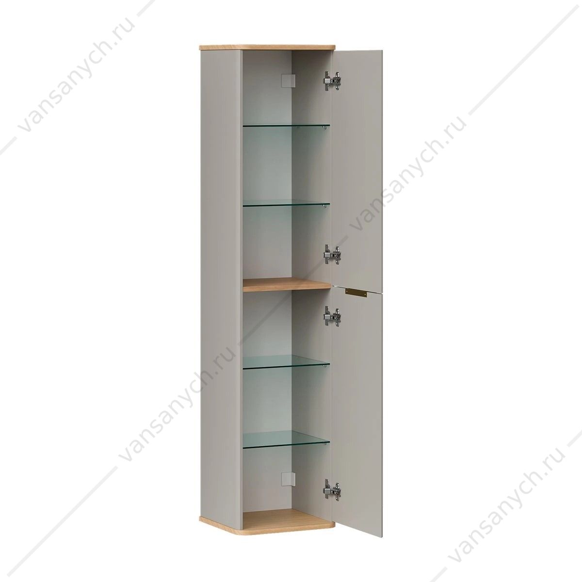 Подвесной пенал с четырьмя стеклянными полками за распашной дверцей. Фасад и корпус пенала выполнены из МДФ и облицованы матовой пленкой ПВХ с эффектом "Soft Touch" в цвете Амарок. Дверца пенала открывается при помощи металлической ручки под золото. Петли на фасадах оснащены доводчиками для плавного и бесшумного закрывания. Пенал универсальный и может устанавливаться как с открыванием налево, так и с открыванием направо.