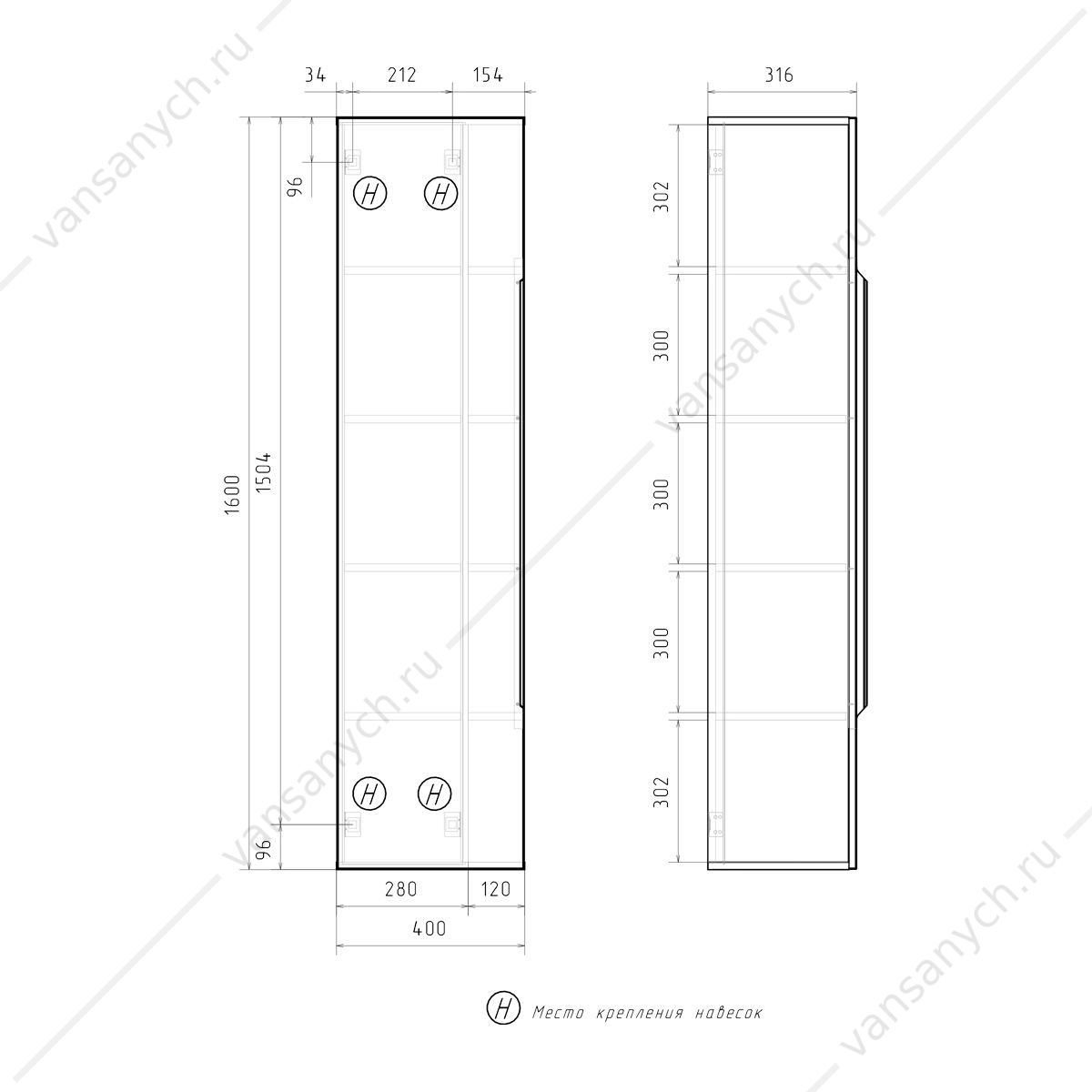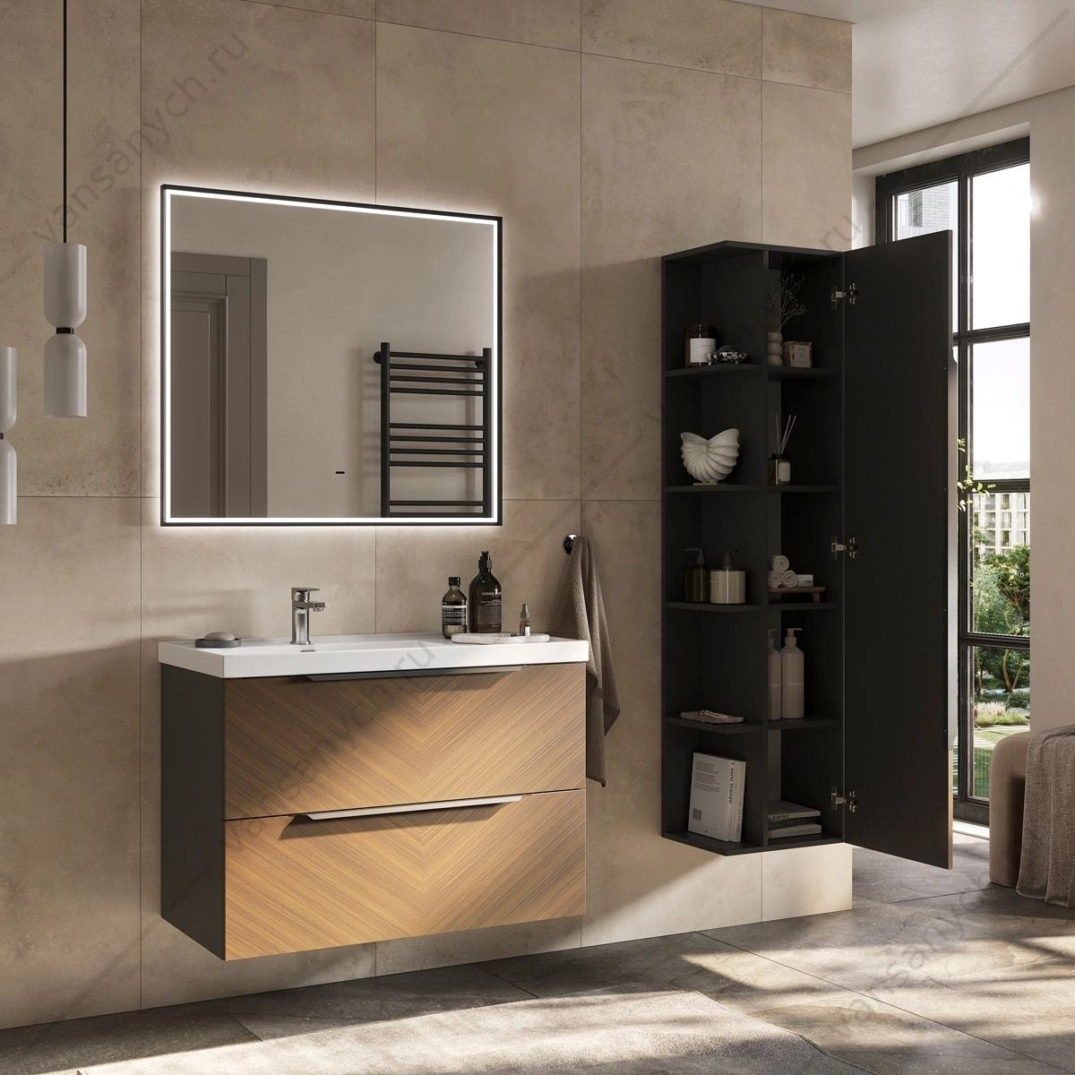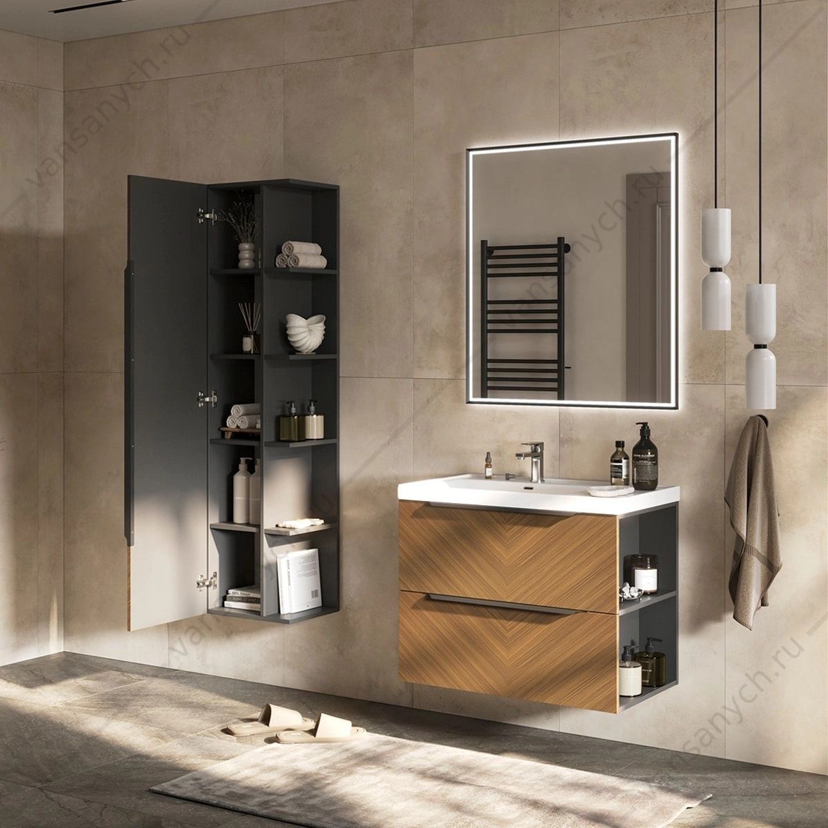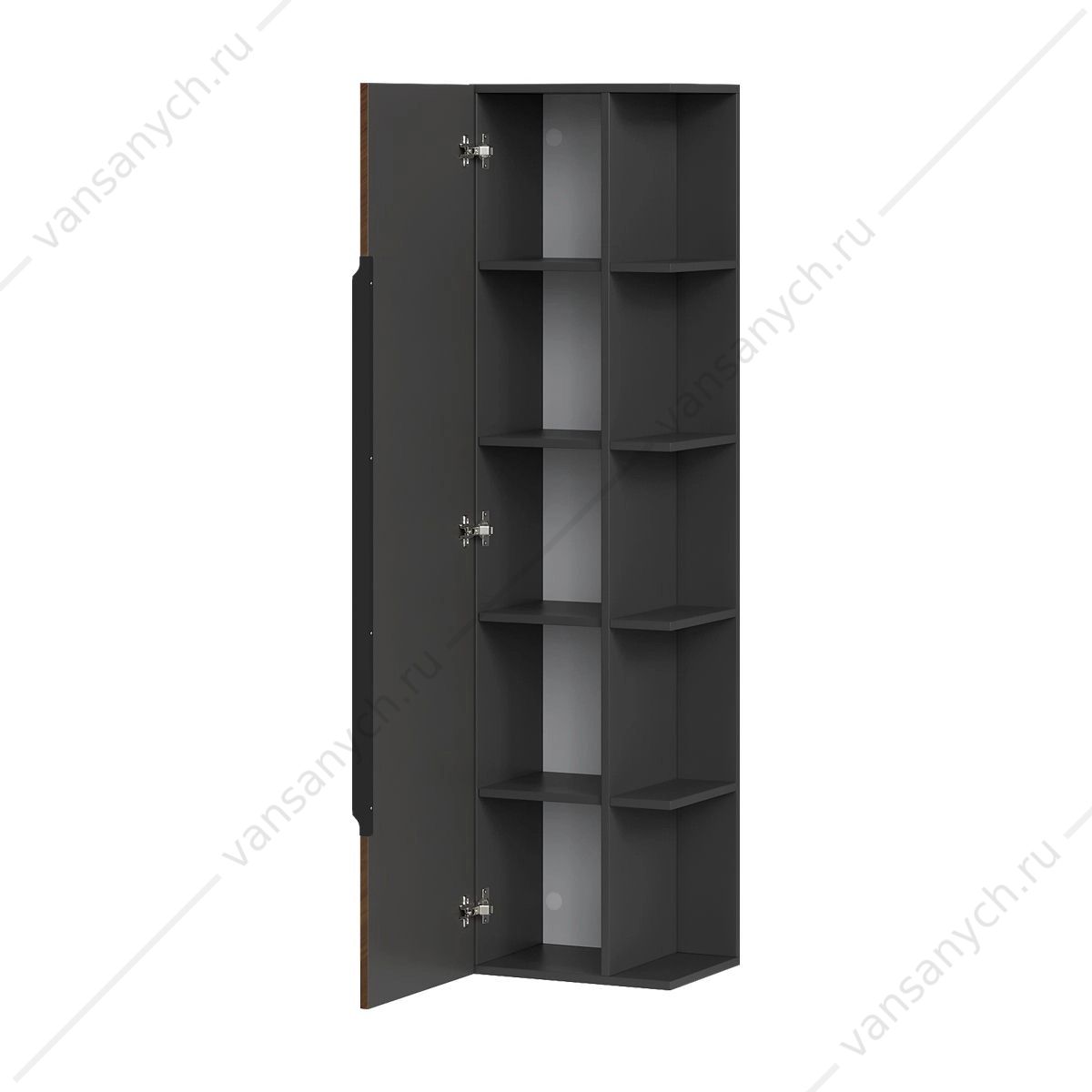 Подвесной пенал с пятью открытыми боковыми полками из ЛДСП и пятью внутренними полками из ЛДСП за распашной дверцей Фасад пенала выполнен из МДФ и облицован пленкой ПВХ с имитацией древесного шпона с диагональным рисунком «ёлочка». Корпус изготовлен из влагостойкого ЛДСП в цвете графит. Дверца пенала открывается при помощи черной матовой металлической ручки. Петли на дверце оснащены доводчиками. Конструкция пенала унверсальна и позволяет установить его как с открыванием дверки на право, так и налево.