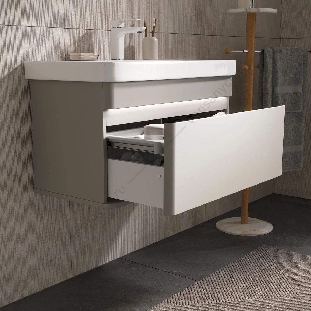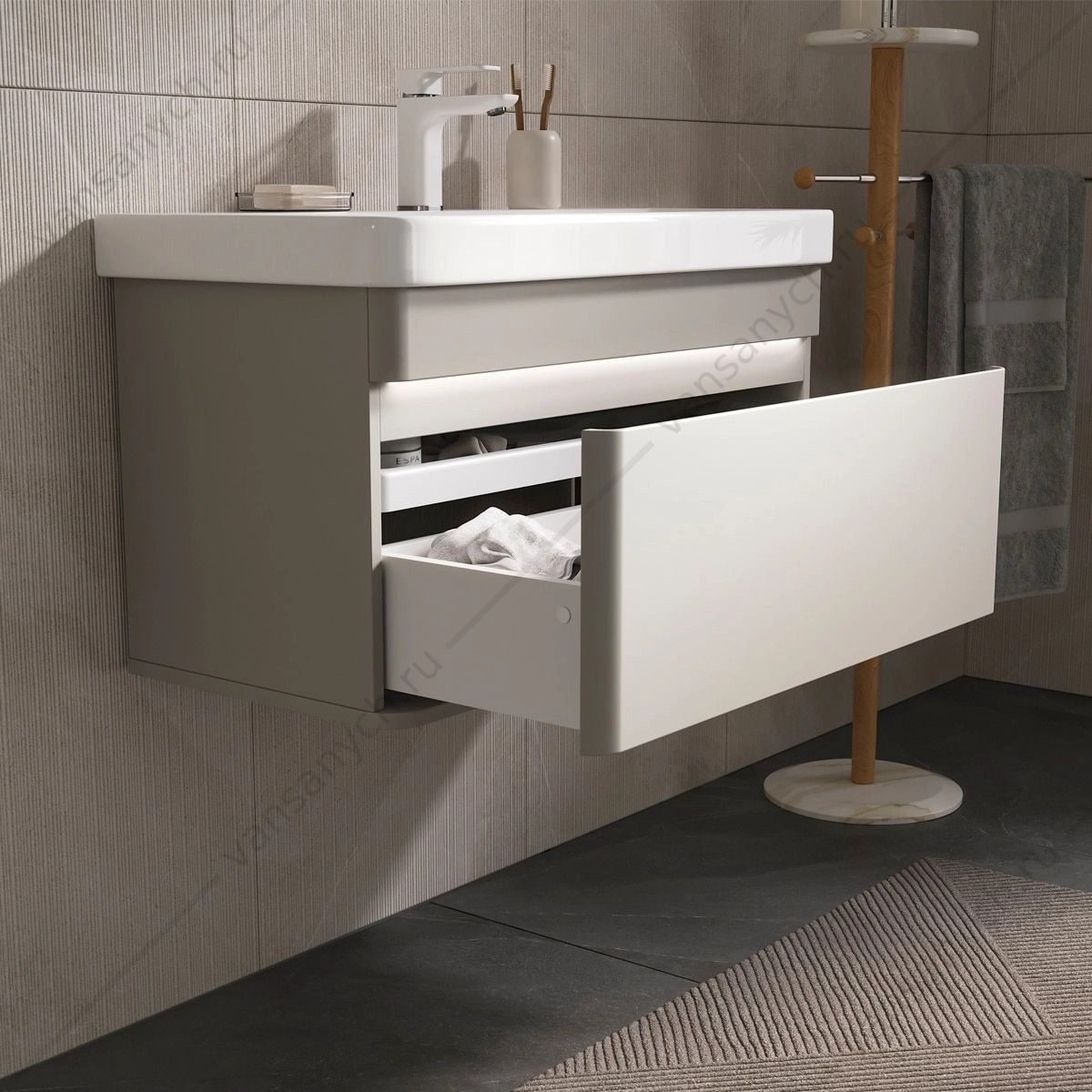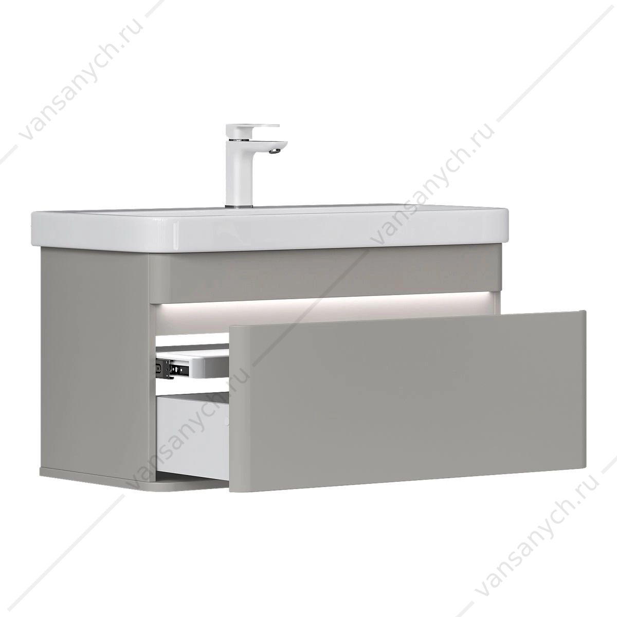 Напольная тумба в цвете Амарок с одним внешним выдвижным ящиком и встроенным выдвижным органайзером для оптимизации хранения из МДФ. Ящик открывается за счет специальной отфрезерованной интегрированной ручки. Направляющие скрытого монтажа внешнего оснащены ящика доводчиками для плавного закрывания. Фасад и корпус тумбы изготовлены из МДФ и облицованы матовой пленкой ПВХ с эффектом "Soft Touch". В царгу тумбы интегрирована декоративная LED-подсветка с нейтральной цветовой температурой. Управление подсветкой происходит при помощи датчика движения, расположенного на дне тумбы. Поставляется в комплекте с сифоном. Может быть установлена как в подвесном варианте, так и на ножки из массива березы (приобретаются отдельно).