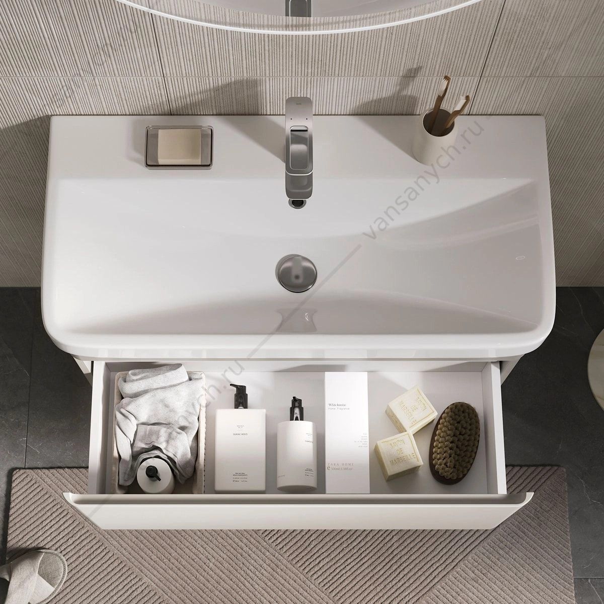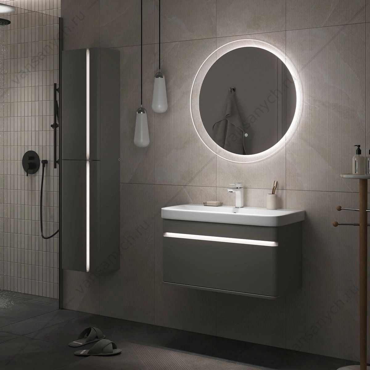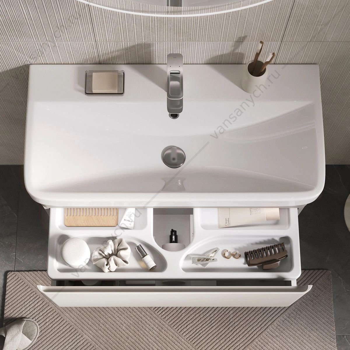 Напольная тумба в цвете Амарок с одним внешним выдвижным ящиком и встроенным выдвижным органайзером для оптимизации хранения из МДФ. Ящик открывается за счет специальной отфрезерованной интегрированной ручки. Направляющие скрытого монтажа внешнего оснащены ящика доводчиками для плавного закрывания. Фасад и корпус тумбы изготовлены из МДФ и облицованы матовой пленкой ПВХ с эффектом "Soft Touch". В царгу тумбы интегрирована декоративная LED-подсветка с нейтральной цветовой температурой. Управление подсветкой происходит при помощи датчика движения, расположенного на дне тумбы. Поставляется в комплекте с сифоном. Может быть установлена как в подвесном варианте, так и на ножки из массива березы (приобретаются отдельно).