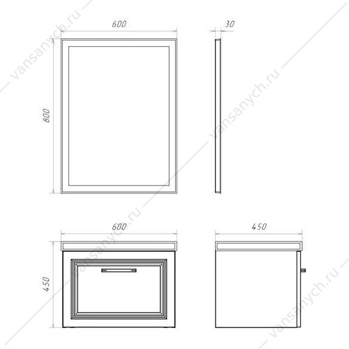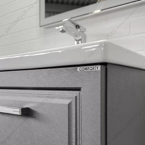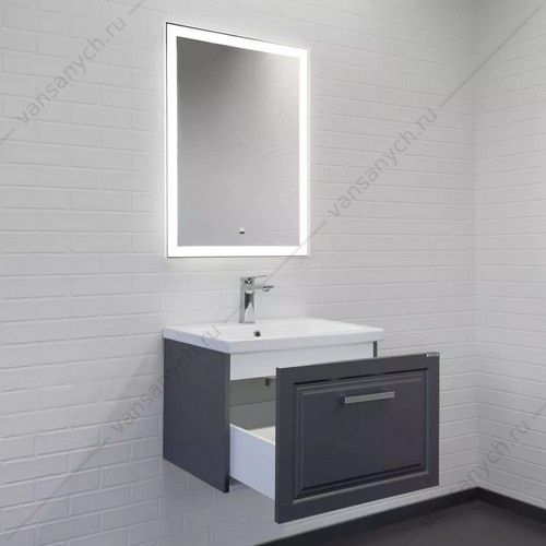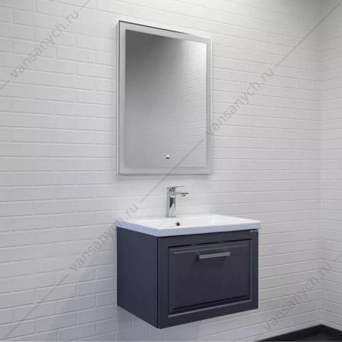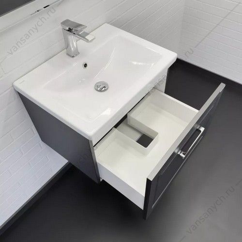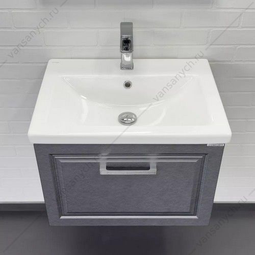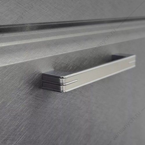 Подвесная тумба-умывальник шириной 60 см с одним выдвижным ящиком. Фасад ящика декорированы фрезеровкой по контуру. Ящик оснащен направляющими с механизмом плавного закрывания. В модели применяется матовая плёнка цвета оружейная сталь с эффектом браширования. Тумба подготовлена для подключения коммуникаций сзади и снизу.