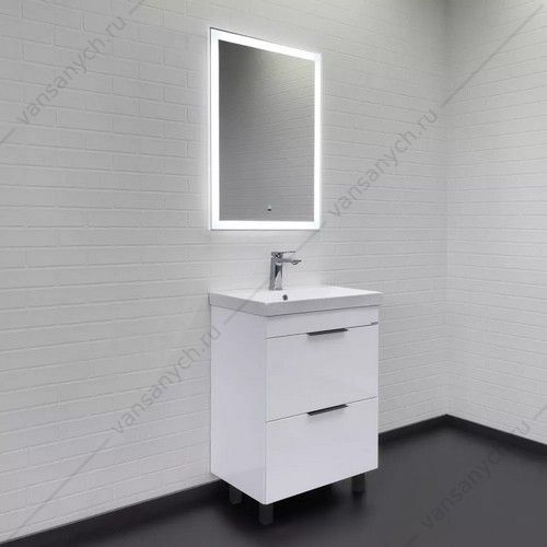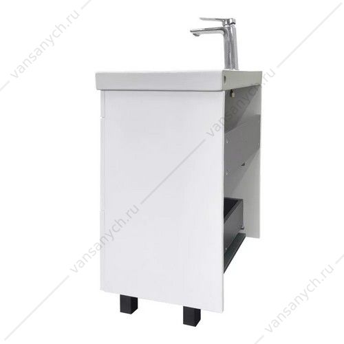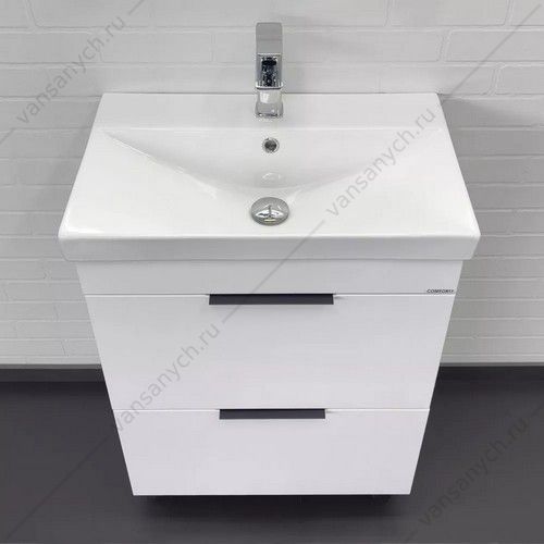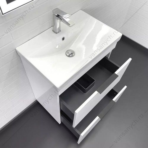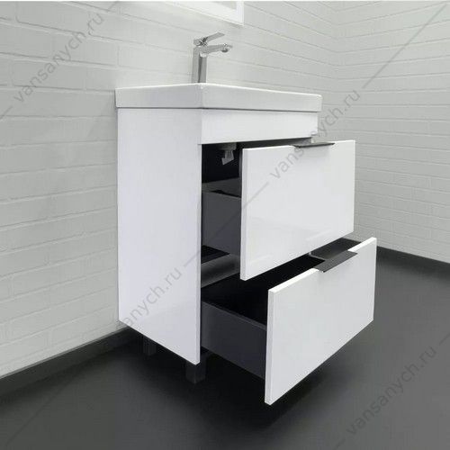 Напольная тумба с двумя большими выдвижными ящиками оборудованными направляющими с системой плавного закрывания. Фасады изготовлены из МДФ и окрашены белой глянцевой эмалью. Внутренние детали тумбы выполнены из влагостойкого ЛДСП цвета графит. Металлические профильные ручки черного цвета. Тумба подготовлена для подключения водоснабжения сзади и снизу.