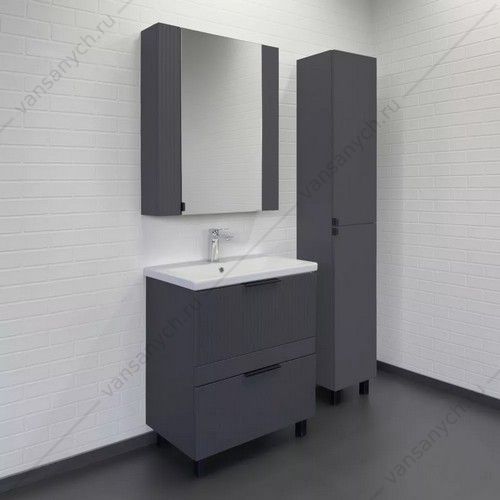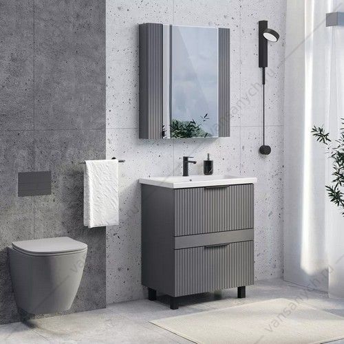 Напольная тумба-умывальник с двумя выкатными ящиками декорированными вертикальной фрезеровкой. Ящики оснащены направляющими с механизмами плавного закрывания. В модели применяется плёнка цвета антрацит с эффектом Soft-Touch. Тумба подготовлена для подключения коммуникаций снизу и сзади.