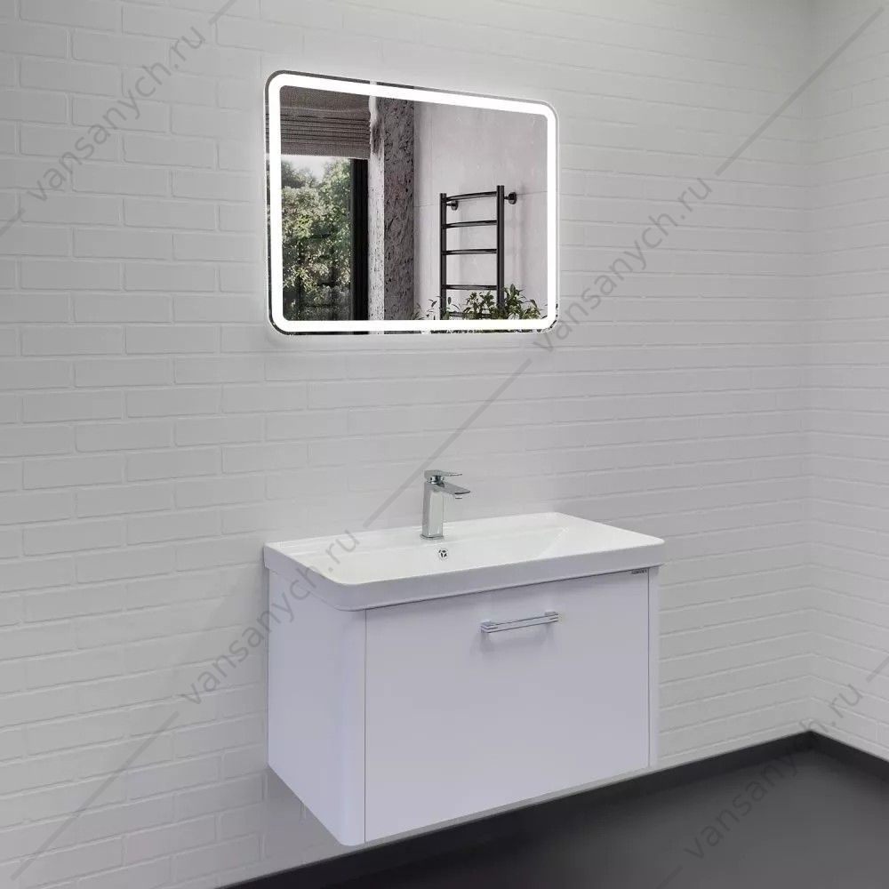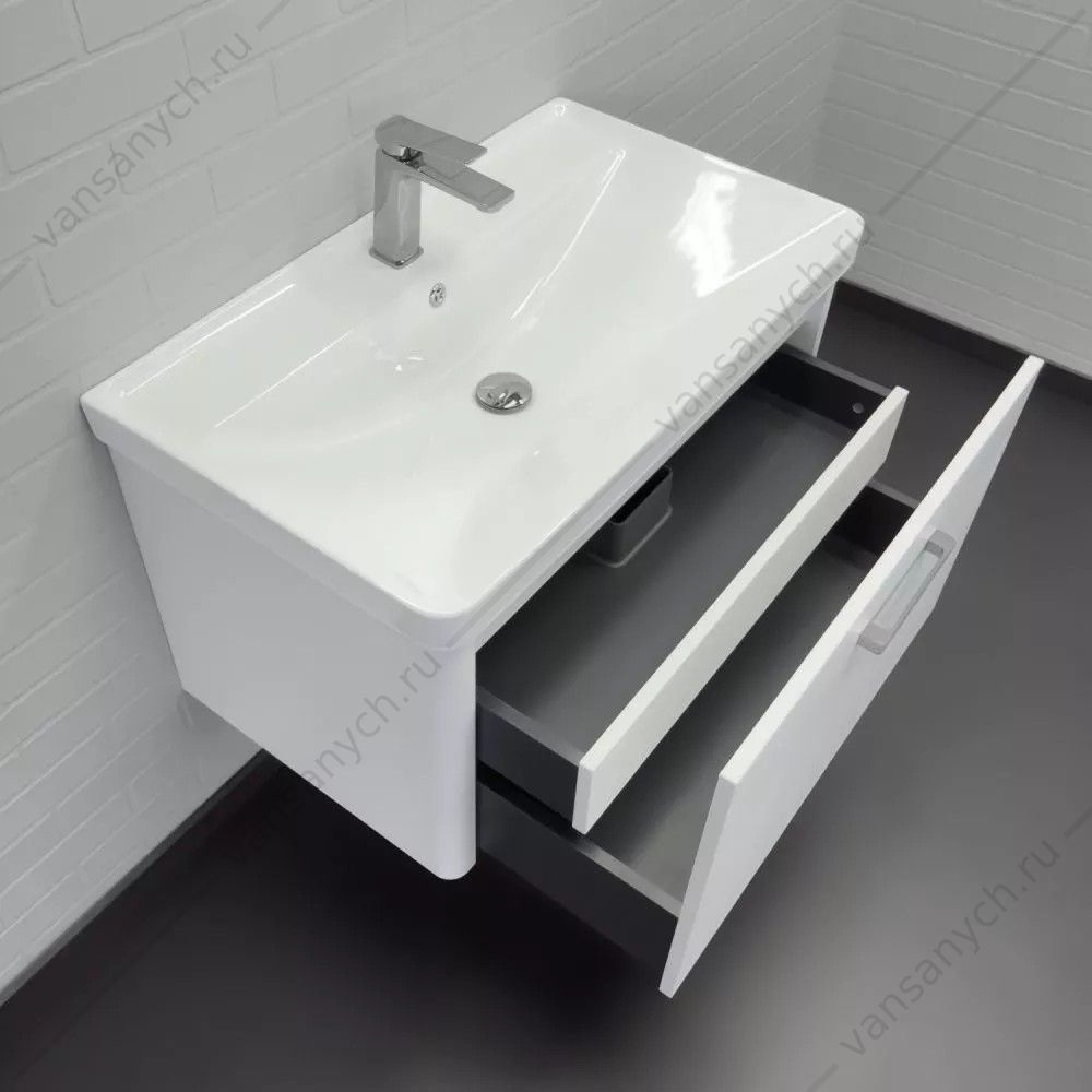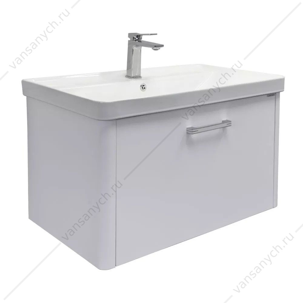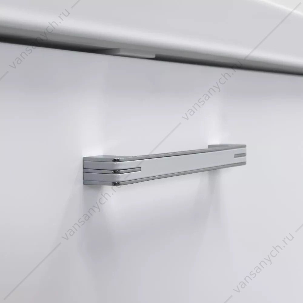 Фасад тумбы из МДФ окрашен белой матовой эмалью. Боковые стенки со стороны фасада скруглены под радиус 30 мм. Оригинальная ручка под естественный хват из алюминиевого сплава.