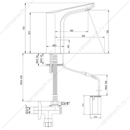 Монтаж на раковину Материал латунь Излив фиксированный Тип подводки гибкая Механизм сенсор Длина излива 100 мм Высота излива 130 мм Высота 152 мм