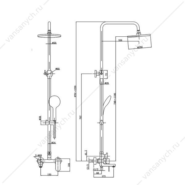 Комплектация: смеситель с поворотным изливом, верхний душ круглый, держатель для душевой лейки, душевая ручная лейка, душевая штанга, душевой шланг, эксцентрики,