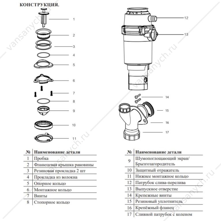 Измельчитель способен переработать остатки овощей и фруктов, яичную скорлупу, остатки разных блюд. Устройство не предназначено для утилизации металлических, стеклянных, пластиковых предметов, волос и шерсти, масла и топленого жира.