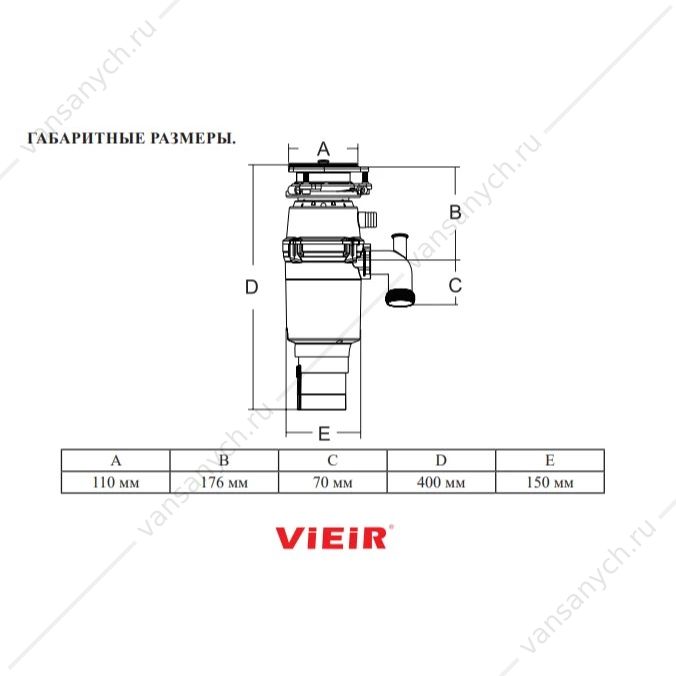 Измельчитель пищевых отходов Vieir VER-724 пневматическое управление. Измельчитель пищевых отходов служит для утилизации остатков пищи. Монтируется непосредственно под кухонную раковину, а слив выводится в канализационную систему.
