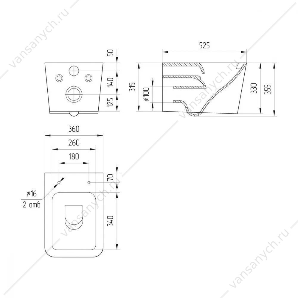 Форма чаши: прямоугольная закругленная, без ободка